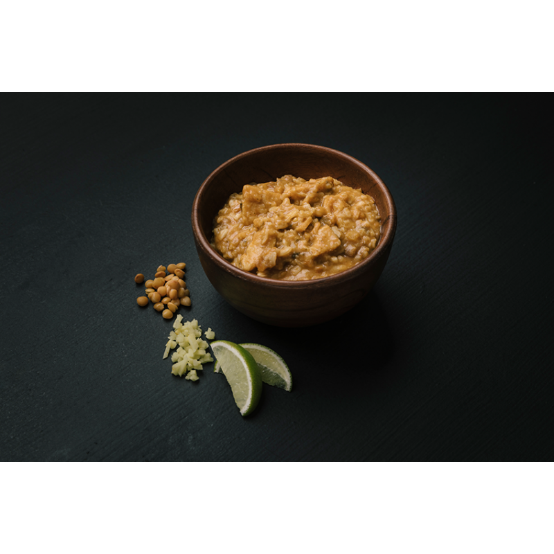 Reis, Huhn (Huhn (89%), Salz, Pfeffer, Stabilisator (E450, E451)) (12%), Linsen (12%), Zwiebeln, Kokosmilch, Sauerrahm (Milch) (3,6%), Maisstärke, Tomatenpaste, Rapsöl, Spinat, Hühnerbouillon (Aroma, Hefeextrakt, Maltodextrin, Huhn, Salz, Zwiebeln, Gewürze), Sojasauce (Soja, Salz, Essig), Limettensaft (1,1%), Gewürze, Ingwer (0,3%), Knoblauch, Antioxidantien (Ascorbinsäure)